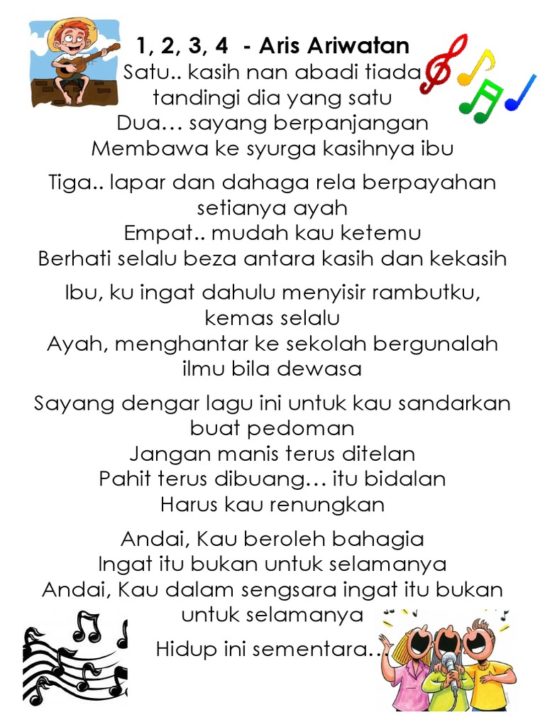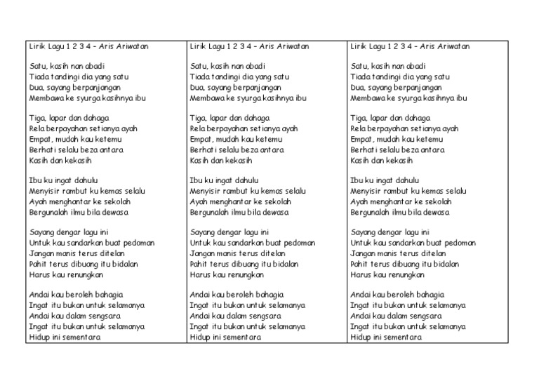 Lirik Lagu Satu dan Abadi - Stinky. Satu kasih nan abadi Tiada tandingi dia yang satu Dua sayang berpanjangan Membawa ke syurga kasihnya ibu Tiga lapar dan dahaga Rela berpayahan setianya ayah. By Ra_Tianna162 12 Apr 2022 Post a Comment Aris Ariwatan 1 2 3 4lyrics Youtube Following of Risk the.
